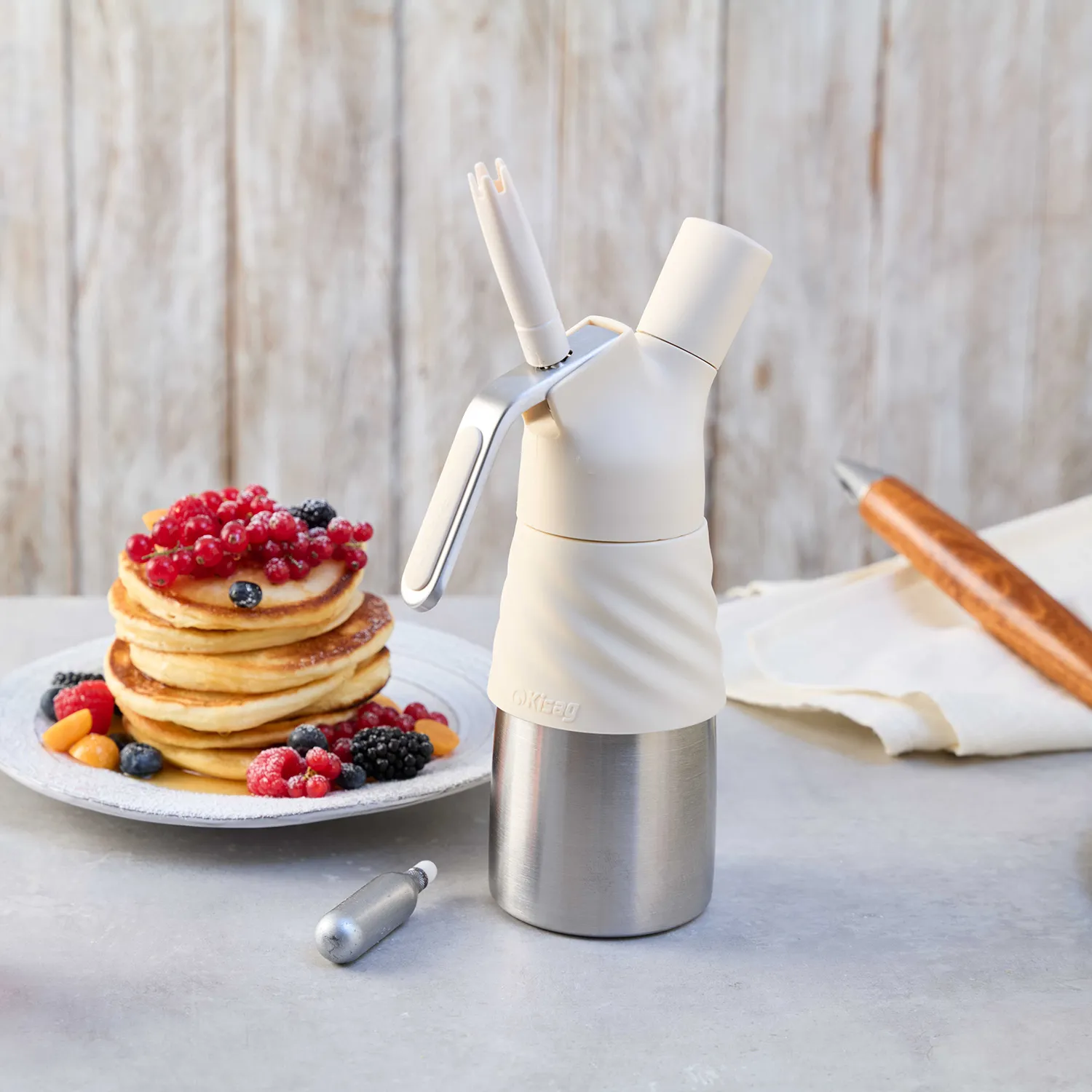 The cream whipper was patented in 1958 and is still available today all over the world in a wide range of designs for cooking enthusiasts and professional gastronomes - for hot and cold applications such as preparing soups, espumas, foams etc.
